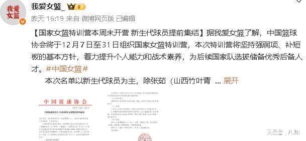 这消息还没消化完,才过了三天,12月4号,圈内知名的媒体人又爆了个猛料:中国篮协要组织国家女篮特训营,张子宇赫然在列,而且,还是以领衔的身份!