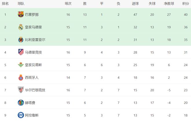 在积分榜上,巴萨战绩是13胜1平2负,以40分高居榜首。皇马紧随其后,拿到36分。皇马比巴萨少踢1轮。第3的是比利亚雷亚尔,拿到35分,只比皇马少1分。输球的马竞依然停留在31分,排名第4,落后榜首的巴萨9分之多。皇家贝蒂斯和西班牙人都是24分,排名第5和第6。
